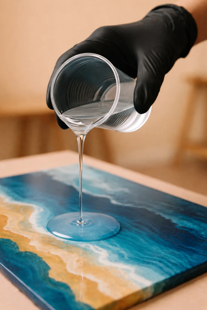 Pour & Spread: Pour the resin mixture onto your project. The self-leveling formula spreads evenly on its own for a smooth finish.