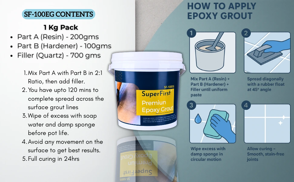 SuperFirst Epoxy Grout SF100-EG is a strong, waterproof grout used to fill tile joints and gaps. It prevents water, dirt and stains from entering, making tiles look clean, hygienic and long-lasting — perfect for bathrooms, kitchens and floors.